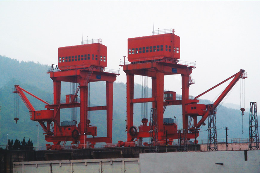 水電站門式起重機是一種門式多功能起重機,主要工作于水電站大壩壩頂或尾平臺,用于發(fā)電機組進水口工作門、排沙底口事故檢修門、攔污柵、泄洪水閘平板工作門等各類閘門的啟閉、搬運,用于機電設(shè)備安裝及壩頂其他設(shè)備的吊運等。大連重工研制的該類產(chǎn)品的主要技術(shù)特點:起重量大(最大1000t)、超載能力強、跨度較小(常為10-20m)、起升高度大、配有自動化或智能化的水下液壓掛梁,可采用各種先進的電氣調(diào)速系統(tǒng)和PLC及網(wǎng)絡控制系統(tǒng)。
