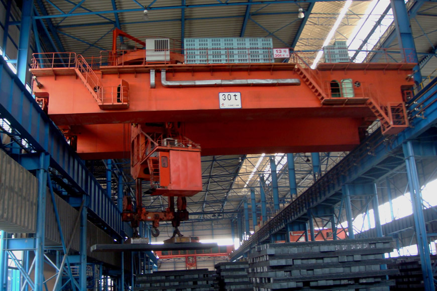 電磁掛梁起重機是搬運方坯、型材、棒線、中厚板、巻板、薄板、管材的主要設備,用于在連軋車間生產線上將成品鋼板、方坯、型鋼從輥道搬運至垛集臺、在成品庫裝卸車輛作業或進行堆集作業。大連重工研制的電磁掛梁起重機分為三大類,分別是:普通電磁掛梁起重機、回轉電磁掛梁起重機和特殊電磁掛梁起重機,規格包括:5+5t~60+60t。
