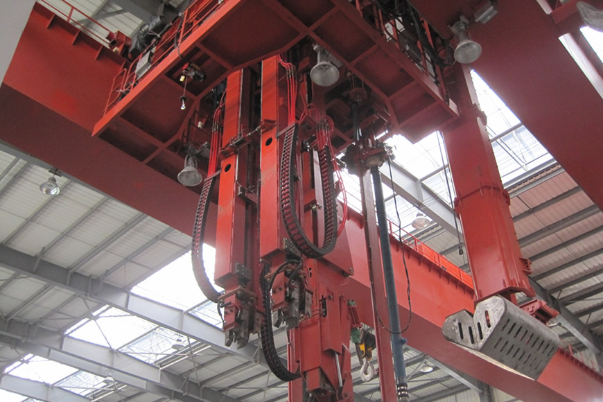鋼錠夾鉗起重機是將冷鋼錠裝入均熱爐或將加熱完成的紅熱鋼錠從爐中取出的起重設備。大連重工研制的鋼錠夾鉗起重機規格包括:20t、40t、45t、60t、65t。